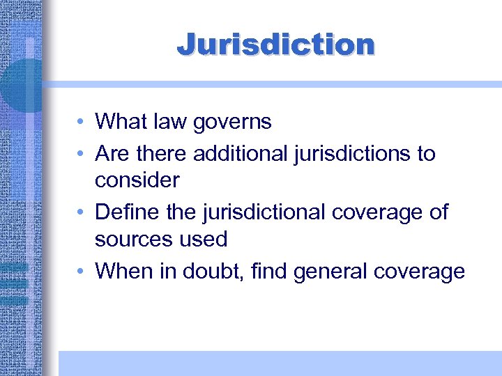 Jurisdiction • What law governs • Are there additional jurisdictions to consider • Define the jurisdictional coverage of sources used • When in doubt, find general coverage
