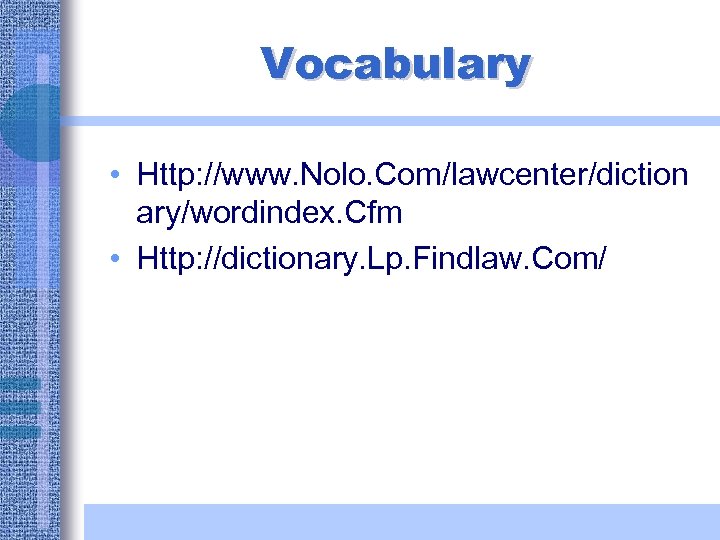 Vocabulary • Http: //www. Nolo. Com/lawcenter/diction ary/wordindex. Cfm • Http: //dictionary. Lp. Findlaw. Com/