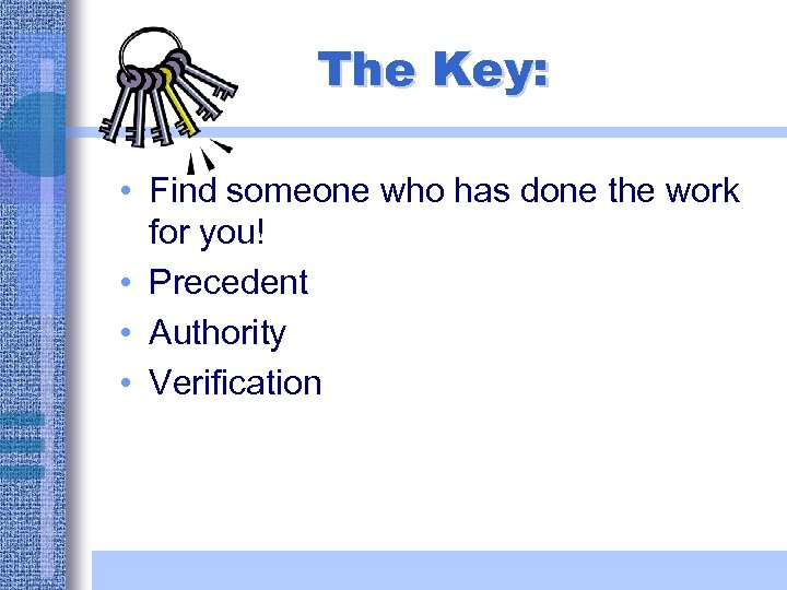 The Key: • Find someone who has done the work for you! • Precedent • Authority • Verification