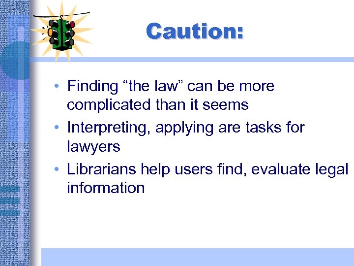 Caution: • Finding “the law” can be more complicated than it seems • Interpreting, applying are tasks for lawyers • Librarians help users find, evaluate legal information