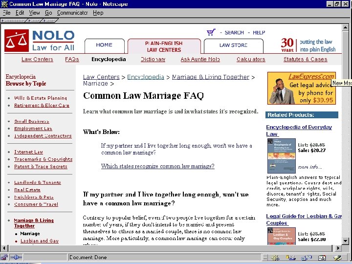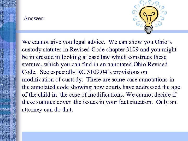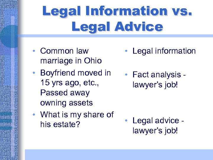 Legal Information vs. Legal Advice • Common law marriage in Ohio • Boyfriend moved in 15 yrs ago, etc. , Passed away owning assets • What is my share of his estate? • Legal information • Fact analysis lawyer’s job! • Legal advice lawyer’s job!