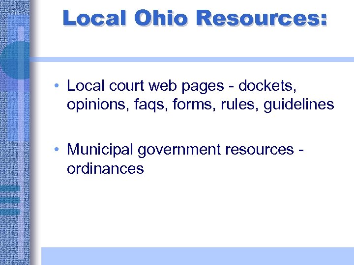 Local Ohio Resources: • Local court web pages - dockets, opinions, faqs, forms, rules, guidelines • Municipal government resources ordinances