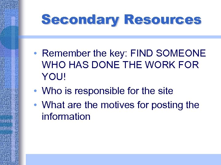 Secondary Resources • Remember the key: FIND SOMEONE WHO HAS DONE THE WORK FOR YOU! • Who is responsible for the site • What are the motives for posting the information