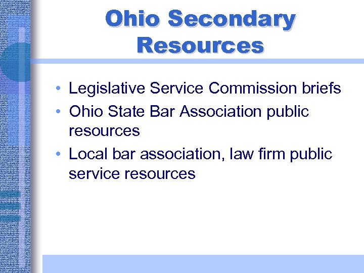 Ohio Secondary Resources • Legislative Service Commission briefs • Ohio State Bar Association public resources • Local bar association, law firm public service resources
