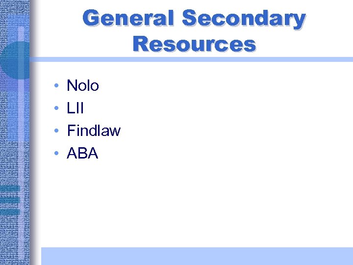 General Secondary Resources • • Nolo LII Findlaw ABA