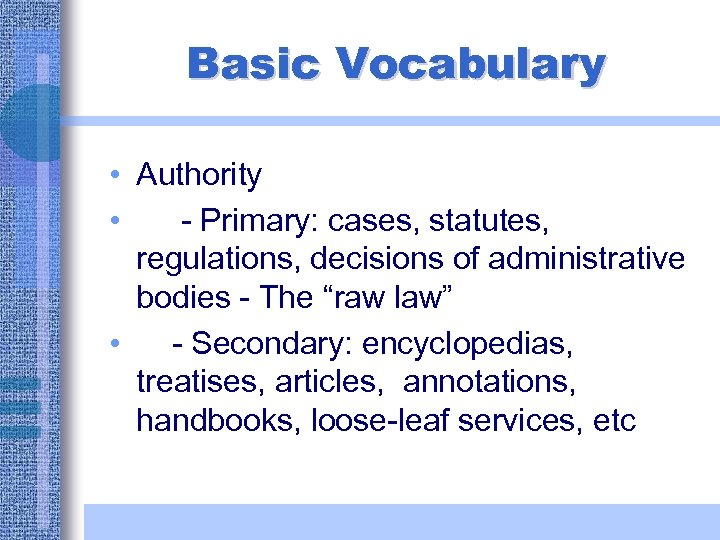 Basic Vocabulary • Authority • - Primary: cases, statutes, regulations, decisions of administrative bodies - The “raw law” • - Secondary: encyclopedias, treatises, articles, annotations, handbooks, loose-leaf services, etc