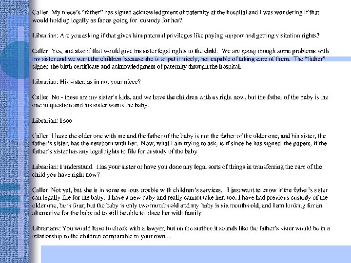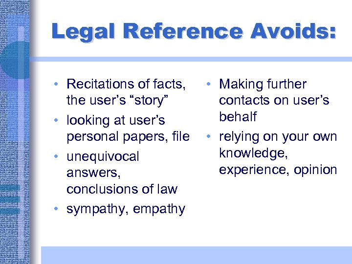 Legal Reference Avoids: • Recitations of facts, the user’s “story” • looking at user’s personal papers, file • unequivocal answers, conclusions of law • sympathy, empathy • Making further contacts on user’s behalf • relying on your own knowledge, experience, opinion