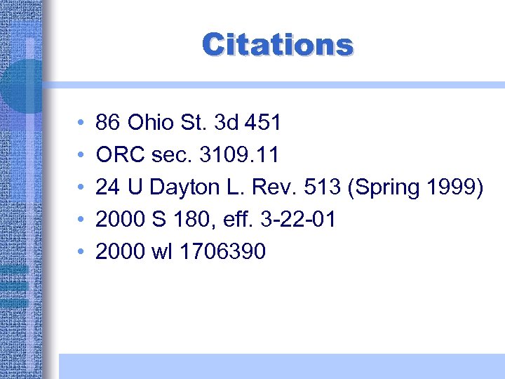 Citations • • • 86 Ohio St. 3 d 451 ORC sec. 3109. 11 24 U Dayton L. Rev. 513 (Spring 1999) 2000 S 180, eff. 3 -22 -01 2000 wl 1706390