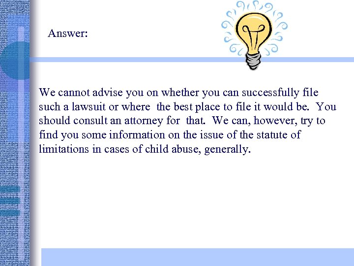 Question: Caller: Can I file a law suit against my father for abuse that occurred during my childhood, even though I am now 32? Librarian: Are you asking about Ohio’s laws? Caller: This happened in Texas. He lives in Ohio.