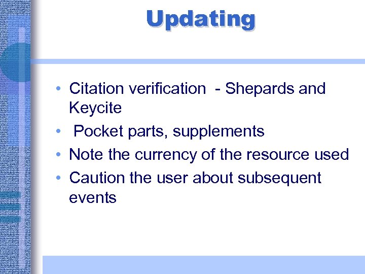 Updating • Citation verification - Shepards and Keycite • Pocket parts, supplements • Note the currency of the resource used • Caution the user about subsequent events