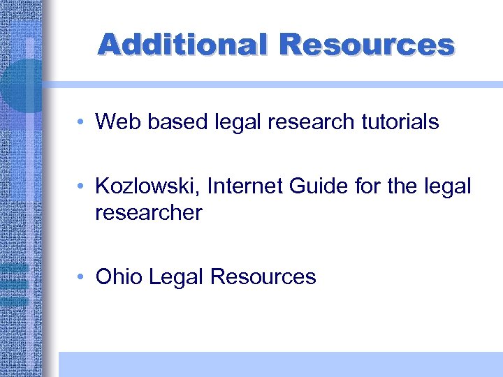 Additional Resources • Web based legal research tutorials • Kozlowski, Internet Guide for the legal researcher • Ohio Legal Resources