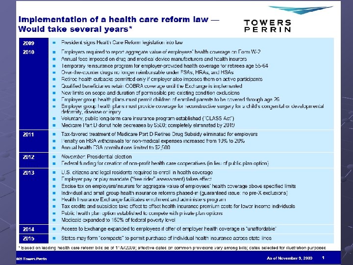 Implementation • Implementation of health reform will take • years- and probably include significant action on the state level Revenue-related items begin immediately, including the new taxes on health insurance premiums, which have not been factored into 2010 play year contracts.