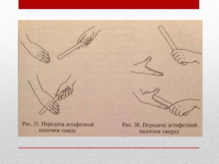 В соответствии с правилами соревнований в эстафетном беге передача палочки осуществляется в коридоре длиной 20 м. Факторы результативности эстафетной команды: 1. показатели индивидуальных результатов спортсменов на соответствующих дистанциях 2. надежность передачи эстафетной палочки 3. согласованность действий партнеров команды. Для обеспечения эффективной передачи бегунам важно обладать чувством пространства и чувство скорости. Способы передачи эстафетной палочки: снизу – вверх и сверху – вниз.
