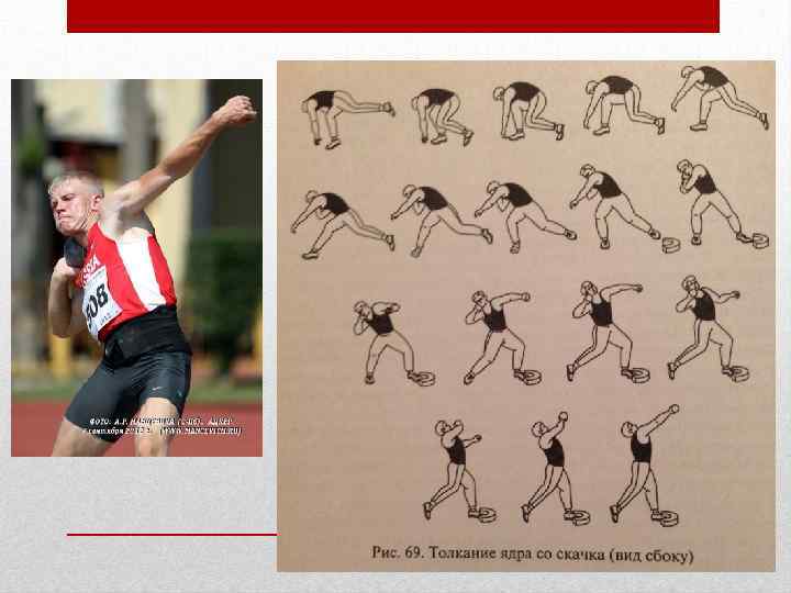 Толкание ядра (К) по структуре ациклический вид, требующий проявления силовых, скоростно-силовых качеств, ловкости. Толкание выполняется из круга (ограниченное пространство), мужчинами и женщинами, на стадионе и в манеже. Основные элементы техники толкания ядра: 1. держание ядра 2. подготовительная фаза к разбегу (скачку, повороту) 3. разбег скачком (поворотом) 4. финальное усилие 5. торможение (или удержание равновесия)