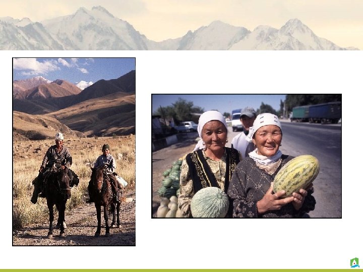 Kyrgyzstan Capital - Bishkek (1 million) Area: 198. 5 thousand sq. km. , o. Mountains 94% (high mountains 70%), o. Valleys 6 % o. Nationalities: 54% Kyrgyz, 23% Russian, 23% other nationalities (German, Ukrainian, Kazakh, Korean, Tartar, Uigur, Uzbek, Tajik, Dungan) o. GDP per capita $ US 7. 500; GDP real growth 5, 7% o. GDP is composed of 39% agriculture, 22% of industry, and 39% of services. o 51% live below poverty line o. Sovereignty – 1991 Language: Kyrgyz – state and Russian - official