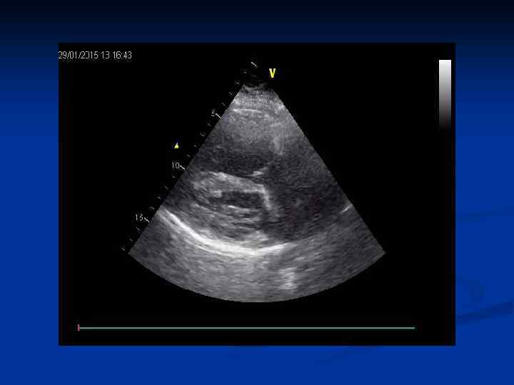 n n n В норме диаметр НПВ< 25 мм (у подростков до 27 мм), печеночная вена- 7 мм. На вдохе НПВ коллабирует ≥ 50% На фоне ЛГ: дилатация НПВ и печеночной вены, на вдохе степень коллабирования < 50% или вообще отсутствует.