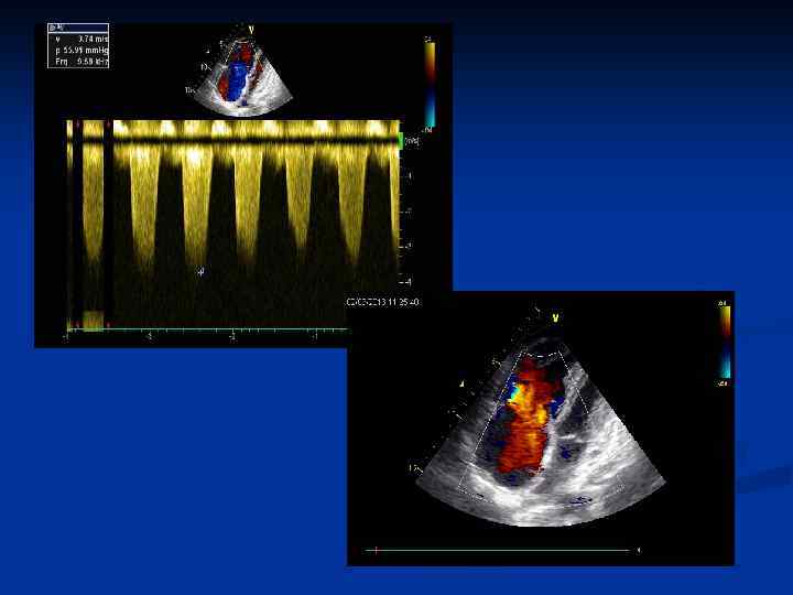n Расчет максимального систолического давления в ЛА по потоку трикуспидальной регургитации. n Рсист ЛА =РGТК +Рпп n n PGсист. ТК =4 V²=4· 2, 52=25 мм. рт. ст. В норме в систолу давление в ПЖ до 30 мм. рт. ст; в ПП 0 -5 мм. рт. ст. n Учитывается состояние ПП и НПВ