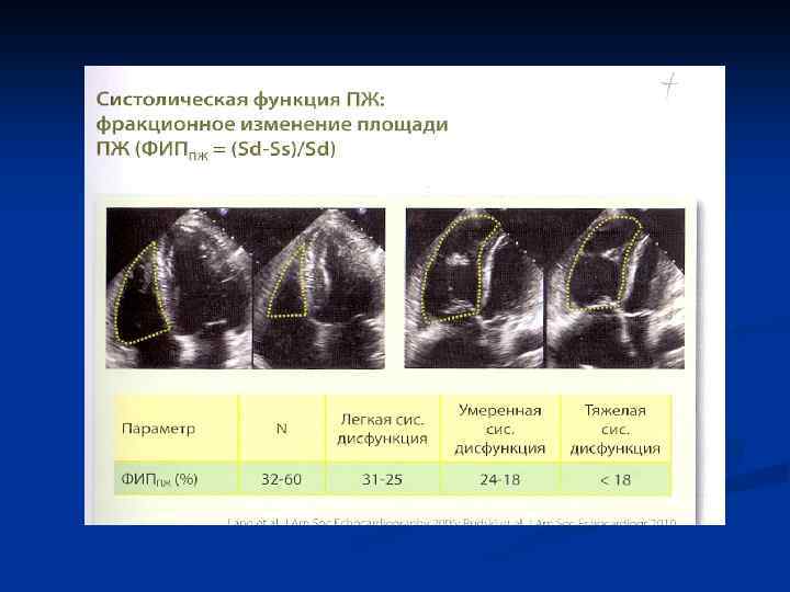Оценка функционального состояния ПЖ. n n n По данным импульсного и тканевого допплера: Е, А, Е´, А´. ТАРSE Фракция уменьшения площади ПЖ. Тканевой допплер: S´ Индекс Тei Оценка диастолической функции ПЖ проводится по аналогии с ЛЖ