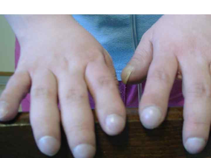 Клиническая картина ХЛС • Осмотр • Компенсированное ХЛС Внешний вид больных неспецифичен и скорее отражает проявления основного заболевания легких и ДН. В большинстве случаев можно обнаружить цианоз, который носит диффузный характер. Конечности при этом остаются теплыми, поскольку отсутствуют существенные нарушения периферического кровотока. Цианоз обусловлен существенным нарушением оксигенации крови в легких и увеличением абсолютного количества восстановленного Hb(выше 40 -50 г/л) в крови, оттекающей от легких. У больных с выраженной гиперкапнией иногда появляется своеобразный болезненный румянец на щеках, обусловленный патологическим расширением периферических сосудов под действием СО 2. Нередко выявляется также расширение и увеличение количества сосудов на коже и конъюнктивах.