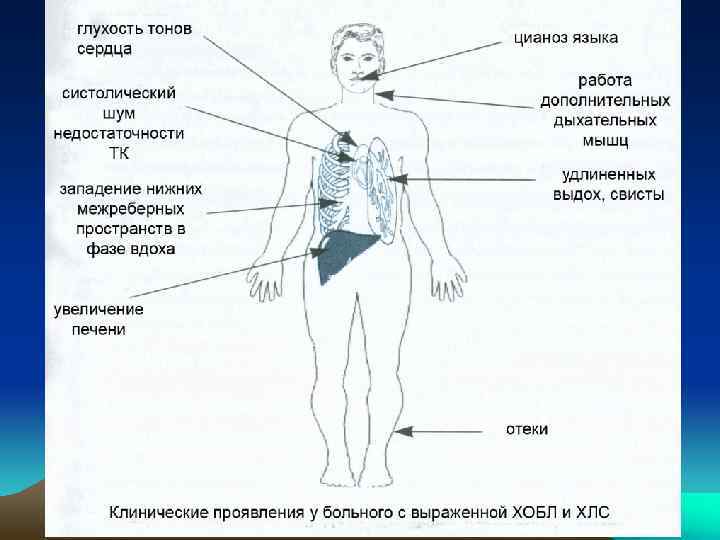 При физикальном осмотре больных определяются симптомы, свойственные ХОБЛ: признаки эмфиземы грудной клетки, коробочный звук при перкуссии, снижение звучности везикулярного дыхания и сухие (иногда и влажные) хрипы, визинг, набухание шейных вен, теплый цианоз (из-за перехода части артериальной крови по шунтам сразу в венозную систему), тахикардия. Тоны сердца обычно трудно выслушать из-за наличия выраженной ЭЛ и большого количества сухих хрипов. Обычно вначале оценивают тип и тяжесть легочной патологии, а потом -- признаки ХЛС. Анализ вентиляции выявляет легкую или умеренную бронхиальную обструкцию. В последующем усиливаются клинические проявления болезни и формируется транзиторная ЛГ (предстадия в формировании стабильного ХЛС), особенно при обострении ХОБЛ. Могут определяться: приглушение тонов сердца и акцент 2 -го тона над ЛА; тахикардия (следствие воспалительного процесса в дыхательных путях и ХДН); нижний край печени (но не из-за увеличения ее размеров, а вследствие опущения диафрагмы); давление на область печени не усиливает набухание шейных вен (отрицательный симптом Плеша).