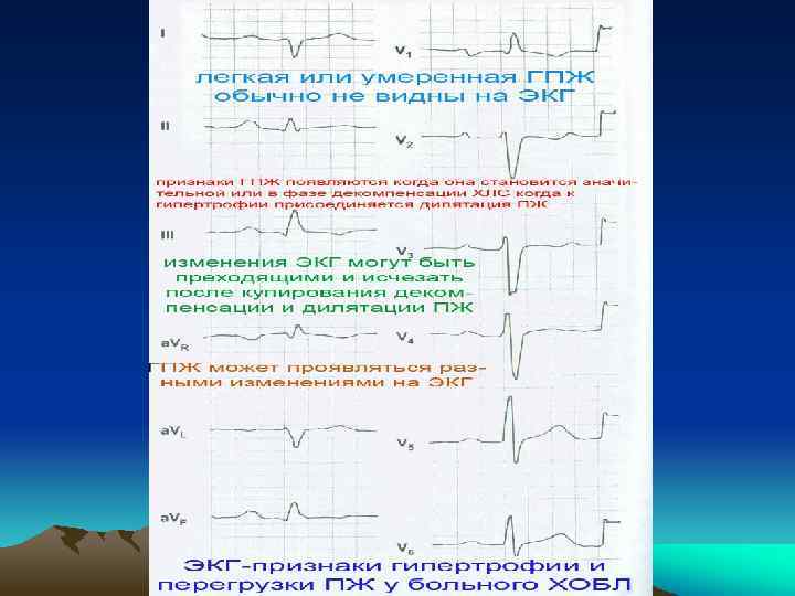 Инструментальная диагностика ХЛС Главный патогенетический фактор его развития - ЛГ. Следовательно ее определение должно быть положено в основу ранней диагностики (ЛГ может быть обратимой в отличие от ГПЖ). Неинвазивные (косвенные) методики: антинуклеарные антитела при серологическом исследовании • (помогают исключить аутоиммунные заболевания - ДБСТ); • оценка КЩС (ночной гипоксемии -- ~25% больных с ночным апноэ имеют ЛГ); полисомнография и пульсоксиметрия (исключение ночных эпизодов гипоксии); • исследование вентиляции легких (обструкция дыхательных путей или рестриктивные нарушения). • ЭКГ- изменения могут быть обусловлены многими факторами: эпизодичностью и величиной ЛГ, смещением сердца эмфизематозными легкими, ишемией миокарда, метаболическими нарушениями. Критерии ХЛС у больных без обструкции бронхов: отклонение ЭОС вправо>110 o; зубец r. S (R/S<1, 0) в отведениях V 5 -6; зубец Rs (R/S>1, 0) в отв. V 1 -2; q. R в V 1 (указывает на тяжелую ЛГ); S 1 -S 2 -S 3 или S 1 -Q 3 -типы; нормальный вольтаж ЭКГ и P-pulmonale (амплитуда зубца Р>1, 5 мм). Недостаток ЭКГ методик -- появление характерных признаков ХЛС только при высокой ЛГ и значительной ГПЖ (чего часто нет при ХОБЛ). Обычно при высоком СДЛА (>75 мм рт. ст. ) ЭКГ симптомы выявляются всегда, при СДЛА ~5575 мм рт. ст. -- в половине случаев и при СДЛА ~ 35 -50 мм рт. ст. -- только в четверти случаев.