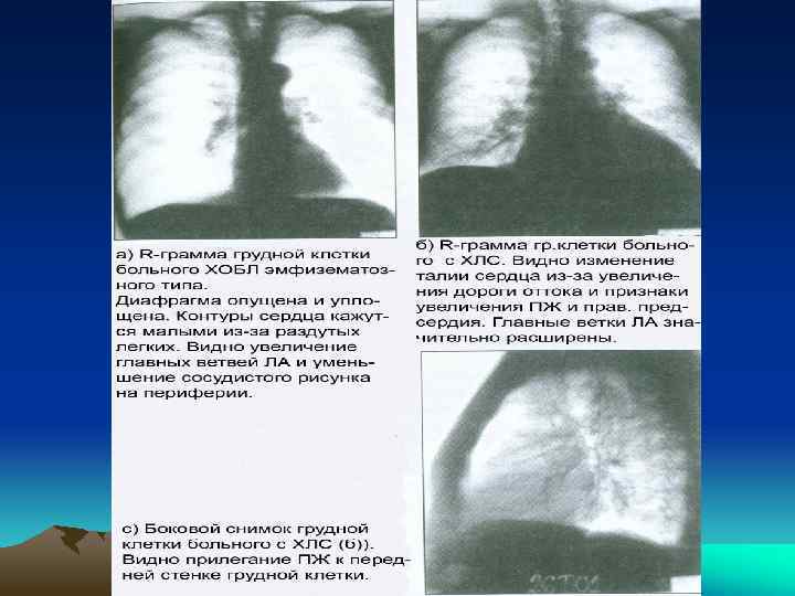 • Эхо. КГ -- ведущий неинвазивный метод оценки функции сердца (патологии клапанов и миокарда), наличия и степени ЛГ, ГПЖ, позволяет визуализировать дилатацию правых отделов сердца (в норме диаметр ПЖ в диастолу <28 мм); верифицировать толщину передней стенки ПЖ (в норме толщина ПЖ составляет 2 -3 мм; диагноз ГПЖ ставится при толщине >3, 5 мм); нарушения профиля движения ПЖ, межжелудочковой перегородки и потоков в области клапанов ЛА и трехстворчатого клапана. Если на них есть регургитация (выявляется у ~50% больных ХОБЛ), то можно рассчитать и ДЛА; • рентгенологическое обследование легких иногда (при выраженной ХСН по ПЖ типу) помогает оценить паренхиму и значительное расширение прикорневых сосудов на фоне обеднения периферического легочного рисунка; выявить гипертрофию ППр и ПЖ на выраженных стадиях болезни; выбухание конуса и ствола ЛА; исключить или верифицировать умеренной тяжести болезни легких или существенное сужение сосудов в системе легочной циркуляции (ясные контры легочных полей на периферии на фоне скудного легочного рисунка и одновременного расширения крупных ветвей ЛА) или ЛГ, возникающую вследствие патологии левых отделов сердца (застой в легочном кровообращении, усиление рисунка легочных вен в верхних легочных полях). При большей части болезней, вызывающих ХЛС, у больных имеются патологические изменения на рентгенограмме легких (выраженная ЭЛ, кифосколиоз, фиброз легких) и выявить проявления ЛГ (дилатацию ствола ЛА и ее ветвей) и ГПЖ в этих условиях трудно.