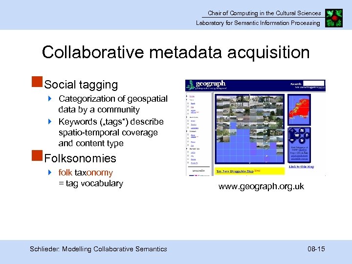 Chair of Computing in the Cultural Sciences Laboratory for Semantic Information Processing Collaborative metadata acquisition n. Social tagging } Categorization of geospatial data by a community } Keywords („tags“) describe spatio-temporal coverage and content type n. Folksonomies } folk taxonomy = tag vocabulary Schlieder: Modelling Collaborative Semantics www. geograph. org. uk 08 -15