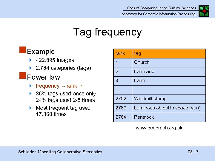 Chair of Computing in the Cultural Sciences Laboratory for Semantic Information Processing Tag frequency n. Example } 422. 895 images } 2. 784 categories (tags) n. Power law } frequency rank - } 36% tags used once only 24% tags used 2 -5 times } Most frequent tag used 17. 360 times rank tag 1 Church 2 Farmland 3 Farm … 2782 Windmill stump 2783 Luminous object in space (sun) 2784 Penstock www. geograph. org. uk Schlieder: Modelling Collaborative Semantics 08 -17