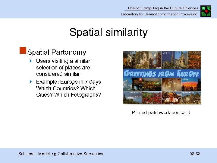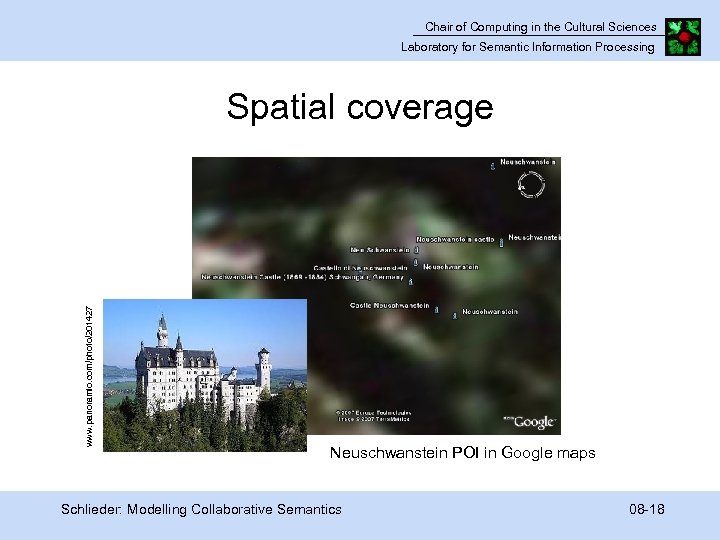Chair of Computing in the Cultural Sciences Laboratory for Semantic Information Processing www. panoramio. com/photo/201427 Spatial coverage Neuschwanstein POI in Google maps Schlieder: Modelling Collaborative Semantics 08 -18