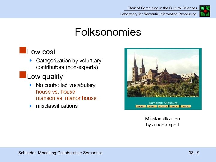 Chair of Computing in the Cultural Sciences Laboratory for Semantic Information Processing Folksonomies n. Low cost } Categorization by voluntary contributors (non-experts) n. Low quality } No controlled vocabulary house vs. house manson vs. manor house } misclassifications Misclassification by a non-expert Schlieder: Modelling Collaborative Semantics 08 -19