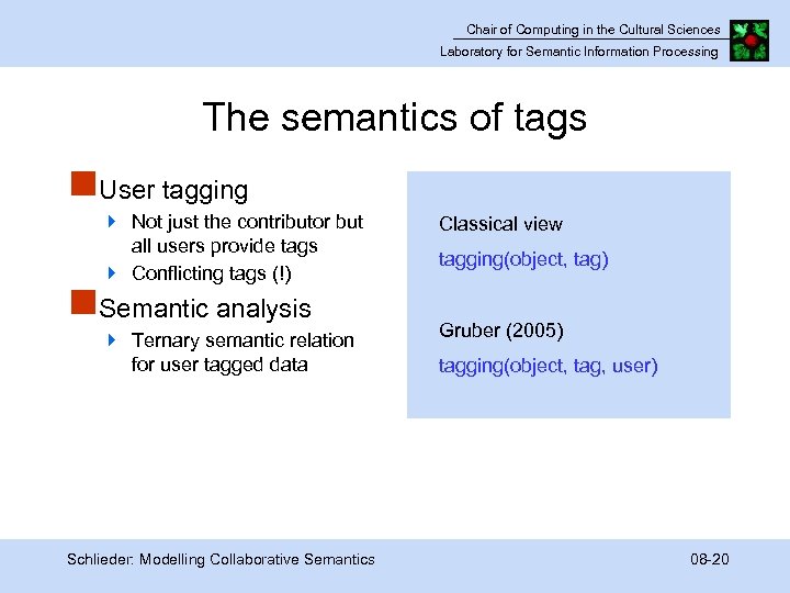 Chair of Computing in the Cultural Sciences Laboratory for Semantic Information Processing The semantics of tags n. User tagging } Not just the contributor but all users provide tags } Conflicting tags (!) Classical view } Ternary semantic relation for user tagged data Gruber (2005) n. Semantic analysis Schlieder: Modelling Collaborative Semantics tagging(object, tag) tagging(object, tag, user) 08 -20