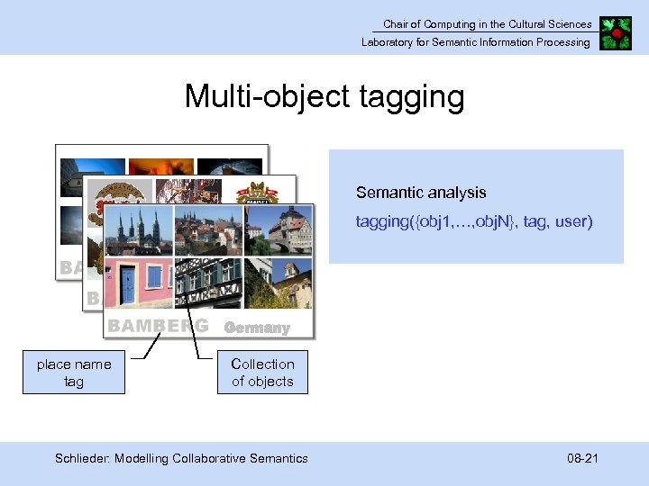 Chair of Computing in the Cultural Sciences Laboratory for Semantic Information Processing Multi-object tagging Semantic analysis tagging({obj 1, …, obj. N}, tag, user) place name tag Collection of objects Schlieder: Modelling Collaborative Semantics 08 -21