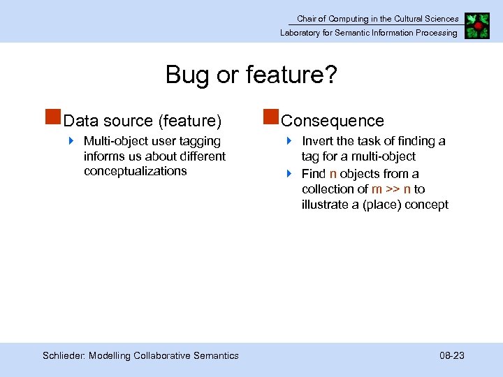 Chair of Computing in the Cultural Sciences Laboratory for Semantic Information Processing Bug or feature? n. Quality problem (bug) } Serious for folksonomies } Even more serious if user tagging is permitted } Unmanageable for multiobject user tagging? Schlieder: Modelling Collaborative Semantics n. Consequence } Use folksonomies only as the poor man‘s ontology 08 -22