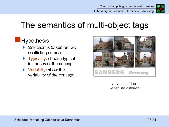 Chair of Computing in the Cultural Sciences Laboratory for Semantic Information Processing Bug or feature? n. Data source (feature) } Multi-object user tagging informs us about different conceptualizations Schlieder: Modelling Collaborative Semantics n. Consequence } Invert the task of finding a tag for a multi-object } Find n objects from a collection of m >> n to illustrate a (place) concept 08 -23