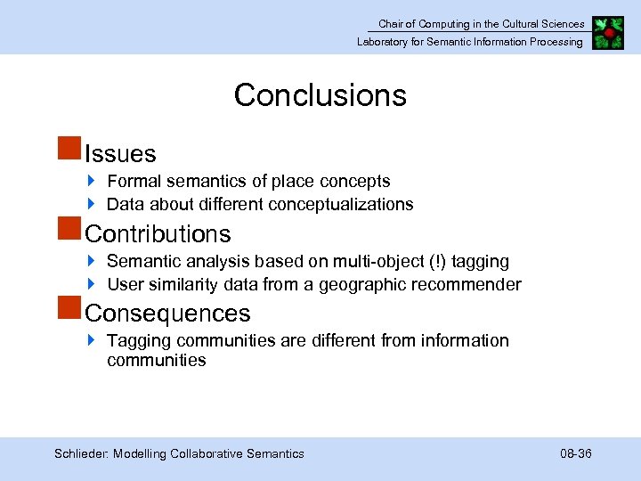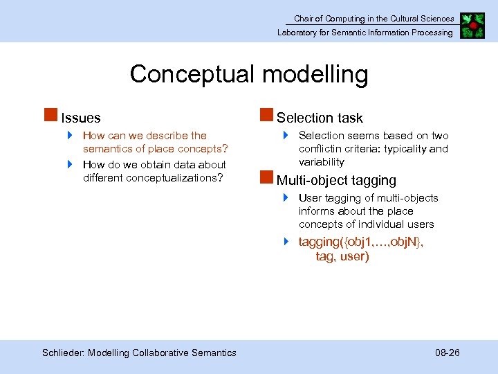 Chair of Computing in the Cultural Sciences Laboratory for Semantic Information Processing Part 1 Geo-information communities Part 2 Collaborative Semantics Part 3 Geographic Recommender Schlieder: Modelling Collaborative Semantics 08 -13