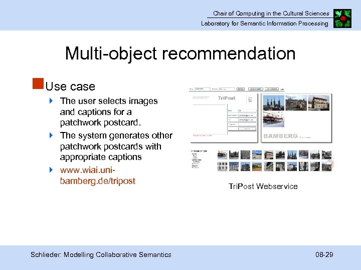 Chair of Computing in the Cultural Sciences Laboratory for Semantic Information Processing Multi-object recommendation n. Use case } The user selects images and captions for a patchwork postcard. } The system generates other patchwork postcards with appropriate captions } www. wiai. unibamberg. de/tripost Schlieder: Modelling Collaborative Semantics Tri. Post Webservice 08 -29