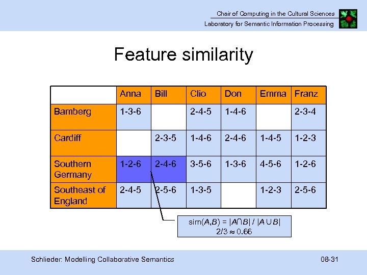 Chair of Computing in the Cultural Sciences Laboratory for Semantic Information Processing Feature similarity Anna Bamberg Bill Clio Don 2 -4 -5 1 -4 -6 2 -3 -5 1 -4 -6 2 -4 -6 1 -4 -5 1 -2 -3 1 -3 -6 4 -5 -6 1 -2 -3 2 -5 -6 1 -3 -6 Cardiff Southern Germany 1 -2 -6 2 -4 -6 3 -5 -6 Southeast of England 2 -4 -5 2 -5 -6 1 -3 -5 Emma Franz 2 -3 -4 sim(A, B) = |A∩B| / |A∪B| 2/3 0. 66 Schlieder: Modelling Collaborative Semantics 08 -31