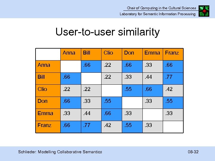 Chair of Computing in the Cultural Sciences Laboratory for Semantic Information Processing User-to-user similarity Anna Clio Don Emma Franz . 66 Anna Bill . 22 . 66 . 33 . 66 . 22 . 33 . 44 . 77 . 55 . 66 . 42 . 33 . 55 Bill . 66 Clio . 22 Don . 66 . 33 . 55 Emma . 33 . 44 . 66 . 33 Franz . 66 . 77 . 42 . 55 Schlieder: Modelling Collaborative Semantics . 33 08 -32