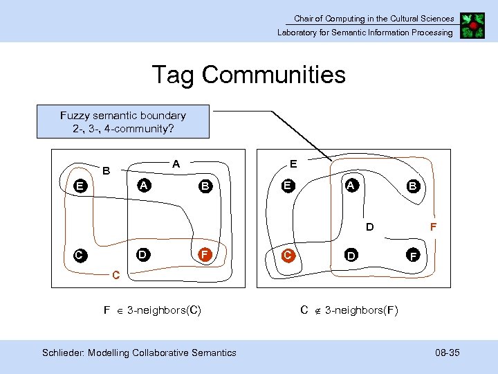 Chair of Computing in the Cultural Sciences Laboratory for Semantic Information Processing Tag Communities Fuzzy semantic boundary 2 -, 3 -, 4 -community? A B A E E B E A B D D C F C D F F C F 3 -neighbors(C) Schlieder: Modelling Collaborative Semantics C 3 -neighbors(F) 08 -35