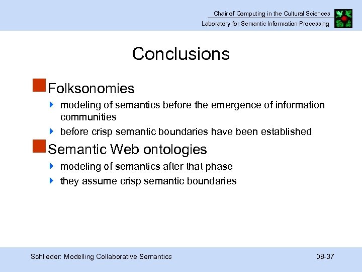 Chair of Computing in the Cultural Sciences Laboratory for Semantic Information Processing Conclusions n. Folksonomies } modeling of semantics before the emergence of information communities } before crisp semantic boundaries have been established n. Semantic Web ontologies } modeling of semantics after that phase } they assume crisp semantic boundaries Schlieder: Modelling Collaborative Semantics 08 -37