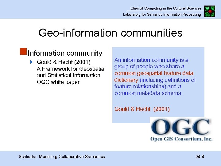 Chair of Computing in the Cultural Sciences Laboratory for Semantic Information Processing Geo-information communities n. Information community } Gould & Hecht (2001) A Framework for Geospatial and Statistical Information OGC white paper An information community is a group of people who share a common geospatial feature data dictionary (including definitions of feature relationships) and a common metadata schema. Gould & Hecht (2001) Schlieder: Modelling Collaborative Semantics 08 -8
