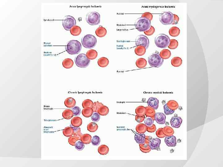 Виды лейкозов по количеству лейкоцитов лейкемические — L- 25 -50* 109 /л, сублейкемические — L- 10 -25* 109 /л алейкемические — L- норма, лейкопенические — L- ниже нормы,
