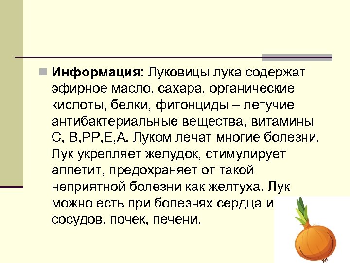 n Информация: Луковицы лука содержат эфирное масло, сахара, органические кислоты, белки, фитонциды – летучие антибактериальные вещества, витамины С, В, РР, Е, А. Луком лечат многие болезни. Лук укрепляет желудок, стимулирует аппетит, предохраняет от такой неприятной болезни как желтуха. Лук можно есть при болезнях сердца и сосудов, почек, печени.