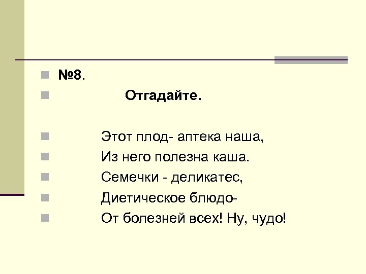 n № 8. n n n Отгадайте. Этот плод- аптека наша, Из него полезна каша. Семечки - деликатес, Диетическое блюдо. От болезней всех! Ну, чудо!