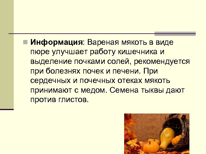 n Информация: Вареная мякоть в виде пюре улучшает работу кишечника и выделение почками солей, рекомендуется при болезнях почек и печени. При сердечных и почечных отеках мякоть принимают с медом. Семена тыквы дают против глистов.
