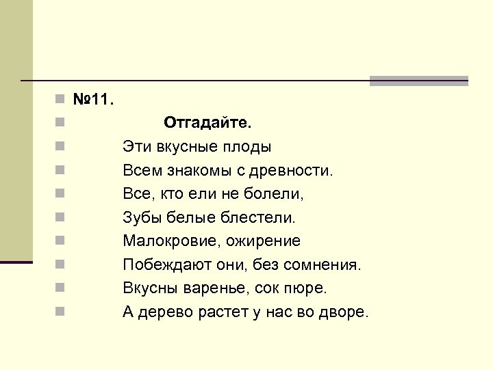 n № 11. n n n n n Отгадайте. Эти вкусные плоды Всем знакомы с древности. Все, кто ели не болели, Зубы белые блестели. Малокровие, ожирение Побеждают они, без сомнения. Вкусны варенье, сок пюре. А дерево растет у нас во дворе.