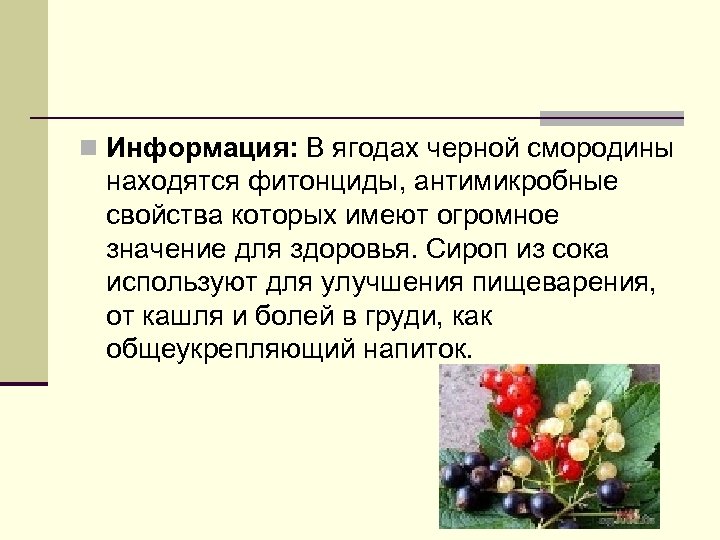 n Информация: В ягодах черной смородины находятся фитонциды, антимикробные свойства которых имеют огромное значение для здоровья. Сироп из сока используют для улучшения пищеварения, от кашля и болей в груди, как общеукрепляющий напиток.