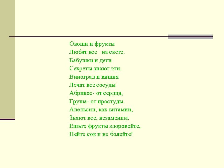 Овощи и фрукты Любят все на свете. Бабушки и дети Секреты знают эти. Виноград и вишня Лечат все сосуды Абрикос- от сердца, Груша- от простуды. Апельсин, как витамин, Знают все, незаменим. Ешьте фрукты здоровейте, Пейте сок и не болейте!