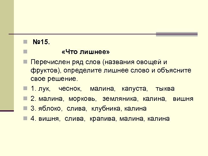 n № 15. n n n «Что лишнее» Перечислен ряд слов (названия овощей и фруктов), определите лишнее слово и объясните свое решение. 1. лук, чеснок, малина, капуста, тыква 2. малина, морковь, земляника, калина, вишня 3. яблоко, слива, клубника, калина 4. вишня, слива, крапива, малина, калина