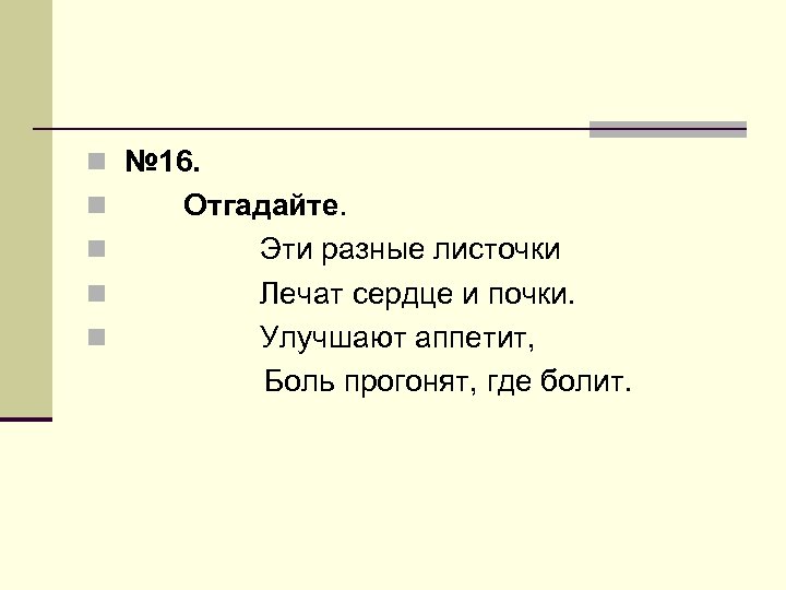 n № 16. n n Отгадайте. Эти разные листочки Лечат сердце и почки. Улучшают аппетит, Боль прогонят, где болит.